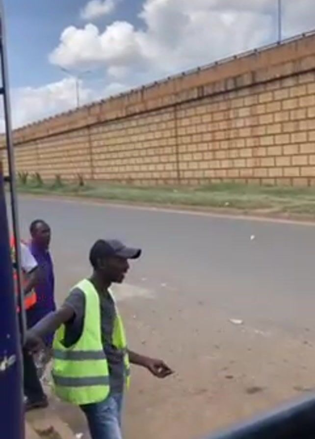 A bus pulls up on the side of a street with two people in safety vests standing near the entrance. One person is holding onto the door while another points across the street. Two people walk across the street, and the bus pulls away. A road with a large wall on one side is visible. The weather is bright and sunny.