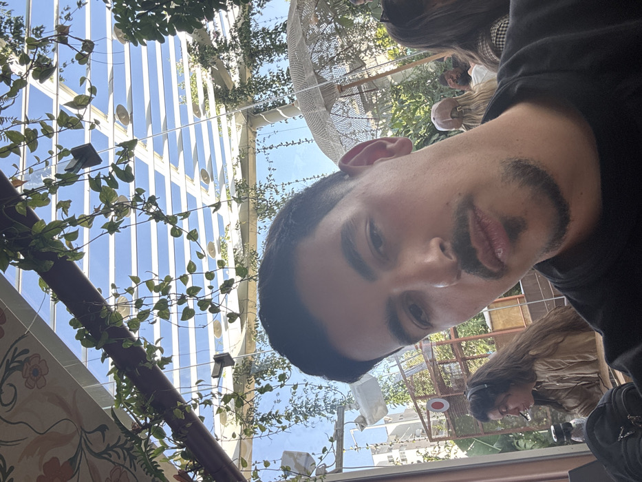 A male subject with dark hair, a mustache, and a short goatee is depicted in a close-up, facing the camera directly. He is wearing a dark short-sleeved top. The setting is an outdoor or semi-outdoor dining area, identified as Cafe Greg in the G Complex, located in Rishon LeZion, Israel. Overhead, a white slatted pergola structure is visible, supporting green climbing vines that drape downwards. A clear blue sky is visible through the slats, indicating daylight. In the left background, a female individual with long dark hair is seated at a table, partially obscured. She is wearing a light-colored shirt and appears to have headphones around her neck or ears, with a laptop open in front of her. A clear water bottle is on the table next to her. Beyond her, an urban background with multi-story buildings is visible through a window or open section. A distinctive red circular emblem with a white inner circle is affixed to a metal lattice structure in the mid-ground. To the right of the primary subject, several other patrons are present in the blurred background. One person with light-colored hair is wearing a baseball cap backward. A large, ornate white umbrella with a decorative pattern provides shade to another area of the establishment.