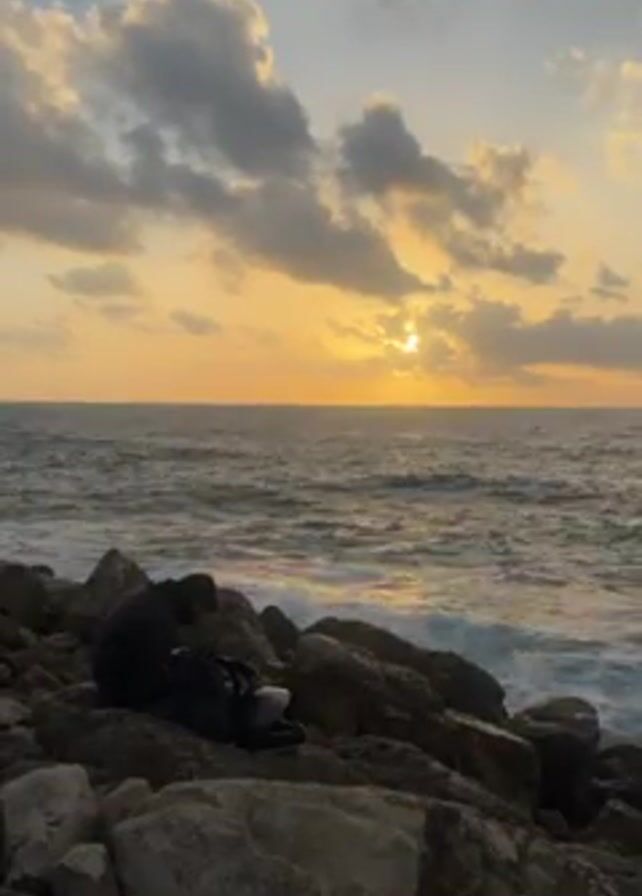 The video captures a serene seaside scene at sunset. A person, dressed in dark clothing, sits on a rocky outcropping near the ocean. Next to the person is a backpack. The ocean water is a dark color, and the setting sun creates a bright, golden path on the water. The sky is filled with clouds, some illuminated by the setting sun. The scene appears calm and still, with only the gentle sound of the waves audible.