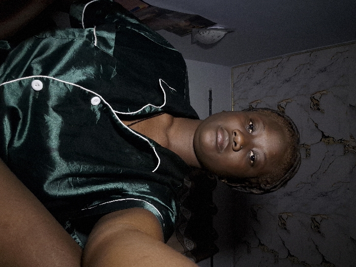 A woman with dark skin and short, braided hair wears a dark green satin pajama top with white piping. She gazes at the camera. The pajama top has two visible white buttons. In the background, a textured wall with a marble-like pattern can be seen. A ceiling fan hangs above, and the lighting in the room is dim. The overall composition is a close-up shot with a slightly angled perspective.