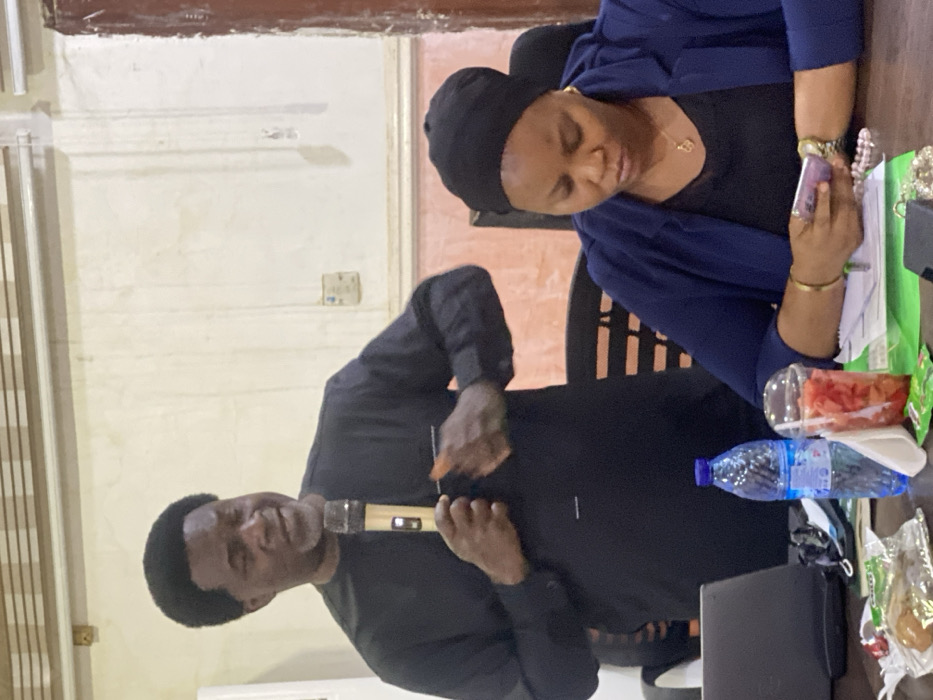 The image portrays an indoor scene featuring two individuals, consistent with a meeting or presentation setting. The specific location in Shaba, Nigeria, cannot be visually confirmed from the image itself. In the left half of the frame, a dark-complexioned adult male stands, wearing a black long-sleeved tunic. He holds a beige and black microphone in his left hand and appears to be speaking, with his mouth slightly open. His right hand is raised and partially closed, indicating a gesture. To the right and slightly in front of the male, a dark-complexioned adult female is seated at a dark-colored table. She wears a black head covering, a dark blue blazer over a black top, a gold-colored necklace, a gold-colored bracelet on her left wrist, and a wristwatch on her right wrist. She is looking down at a light-colored smartphone held in both hands. The table in front of the female subject holds a silver-colored open laptop, a clear plastic bottle of CWAY pure water, a clear plastic cup containing chopped red fruit with a plastic fork, a clear plastic bag containing pastries, several white papers, a green folder, a pen, a beaded bracelet, and a small dark pouch. The background consists of a light-colored wall exhibiting streaking and minor discoloration. A white power socket is visible on the wall. Horizontal decorative trim is present along the lower section of the wall, and brown horizontal strips are visible near the top, possibly ceiling detailing. A dark brown vertical structure is partially visible on the far right.