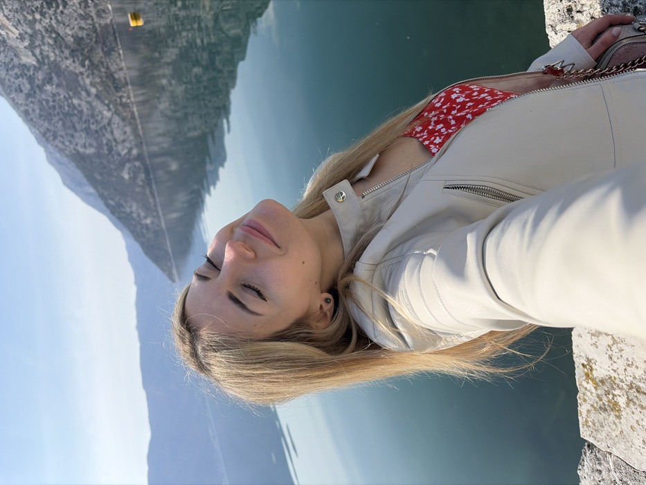 The image depicts a young adult female taking a selfie on the waterfront in Risan, Montenegro