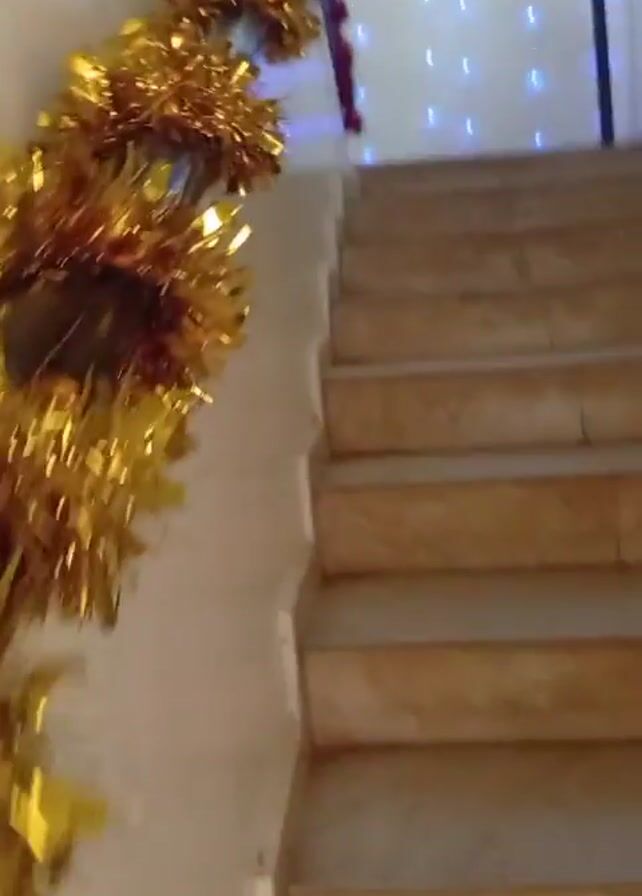 The camera pans up a set of interior stone stairs decorated with gold and red tinsel. The lights at the top of the stairs are red and white. The stairs have a metal railing on one side.