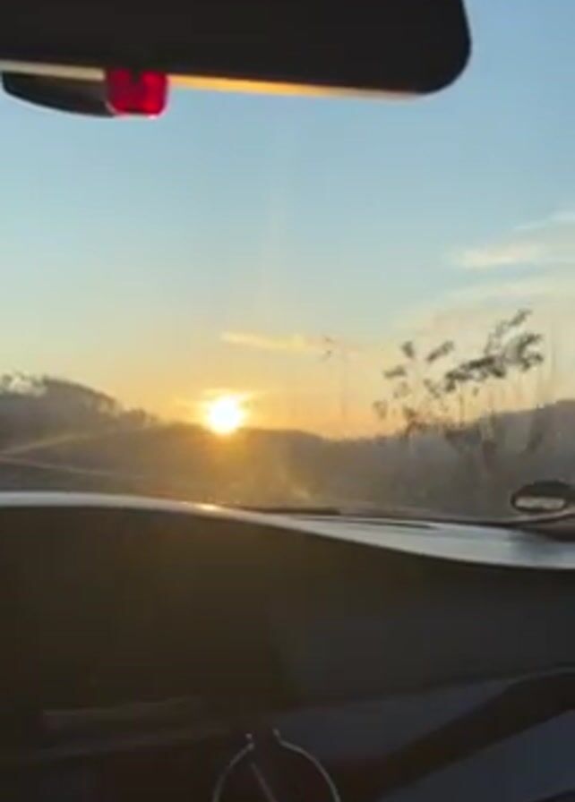 From the interior of a car, the camera captures a view of a sunrise over a slightly hilly landscape
