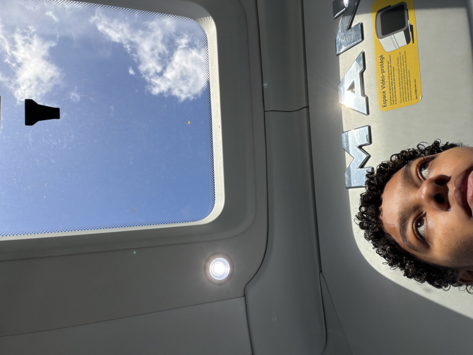 The image provides an upward perspective from within the passenger compartment of a Keolis public transport vehicle, likely a MAN model bus or coach, operating in the Île-de-France region of France, specifically implied to be in or around Noisiel. The upper section of the frame shows a rectangular sunroof revealing a bright blue sky with scattered white cumulus clouds. A small, dark, inverted T-shaped object is adhered to the sunroof glass, which also displays minor surface debris or scratches and a small, blurred orange element. Below the sunroof, the vehicle's light-colored ceiling is visible, featuring an illuminated circular LED light fixture on the left. Prominently displayed on the ceiling are large, metallic, reflective letters spelling "MAN." To the right of these letters, a yellow rectangular sticker is affixed. This sticker, with text in French, designates the area as "Espace Vidéo-protégé" (Video-protected area) and includes contact information, specifically "dpo.idf@keolis.com" and the company name "Keolis," confirming its operational context within Île-de-France. The lower portion of the image shows the top of a person's head and face, with dark, curly hair and brown skin. The individual is looking upwards towards the sunroof, with direct sunlight casting highlights across their forehead and nose.