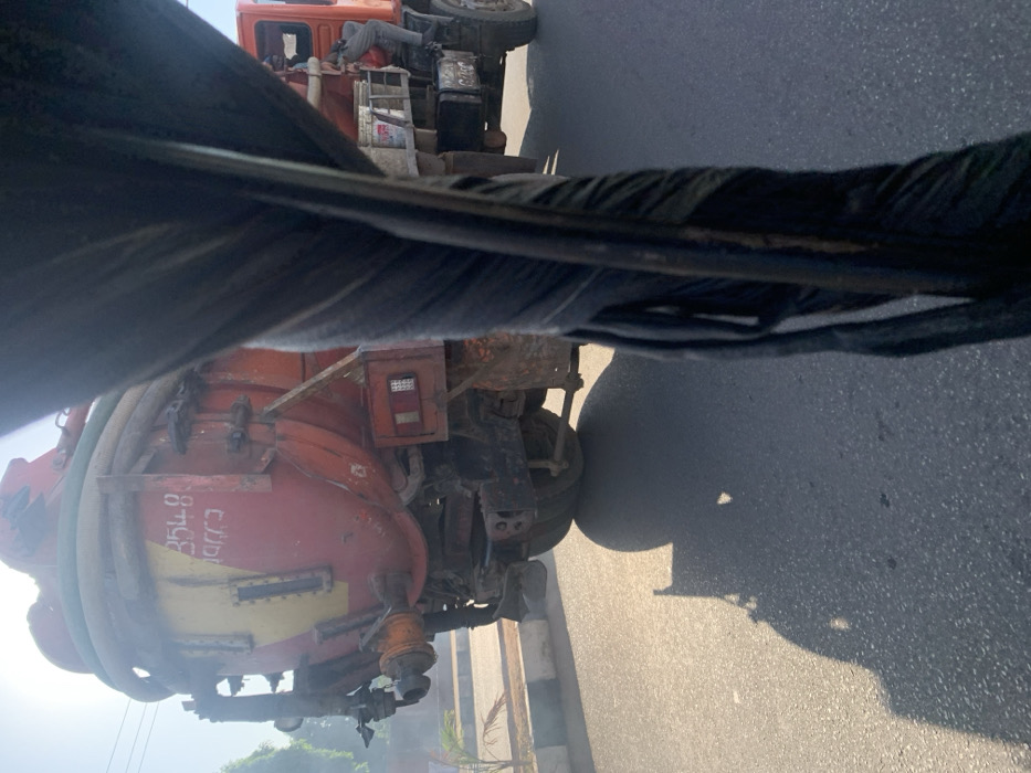 An image taken in Barakin Lerawi, Nigeria, depicts the rear-left perspective of a large, weathered, red and yellow tanker truck on an asphalt road under bright daylight. The cylindrical tank section of the truck displays "3548" and Arabic script. Plumbing and hoses are visible on the left side of the tank. A single individual, dressed in light attire, is positioned on the passenger side step of the truck's cab, partially obscured. The truck's rear wheels are visible, and faint smoke or dust emanates from its left rear side. A grey and white painted road curb borders the left side of the road. Strong shadows are cast on the asphalt, indicating a high sun position. The immediate foreground on the right is heavily obscured by a large, dark, out-of-focus object, possibly a twisted cable or part of the camera's immediate surroundings.