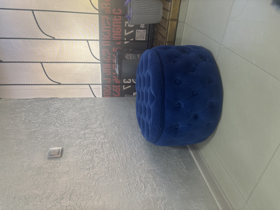 The image depicts an indoor corner of a premises in Kutaisi, Georgia. A round, royal blue velvet ottoman, approximately 60 cm in diameter and 45 cm high, with a tufted top and sides, is positioned on light grey square floor tiles. To the left, a light grey wall with a coarse, textured finish displays a single white light switch at mid-height. To the right of the ottoman, a window is visible, secured by decorative black metal bars. Behind these bars, a dark red or black sign featuring white Georgian script is present, displaying the words "შეამოწმეთ" (check/verify) and "მენიუ" (menu), along with a QR code. On a wooden platform beneath the window, a black lidded bin and a grey perforated plastic basket are situated. The window itself is covered by a translucent white screen or blind, diffusing ambient light. A white baseboard runs along the bottom of the textured wall. No individuals are present in the scene.