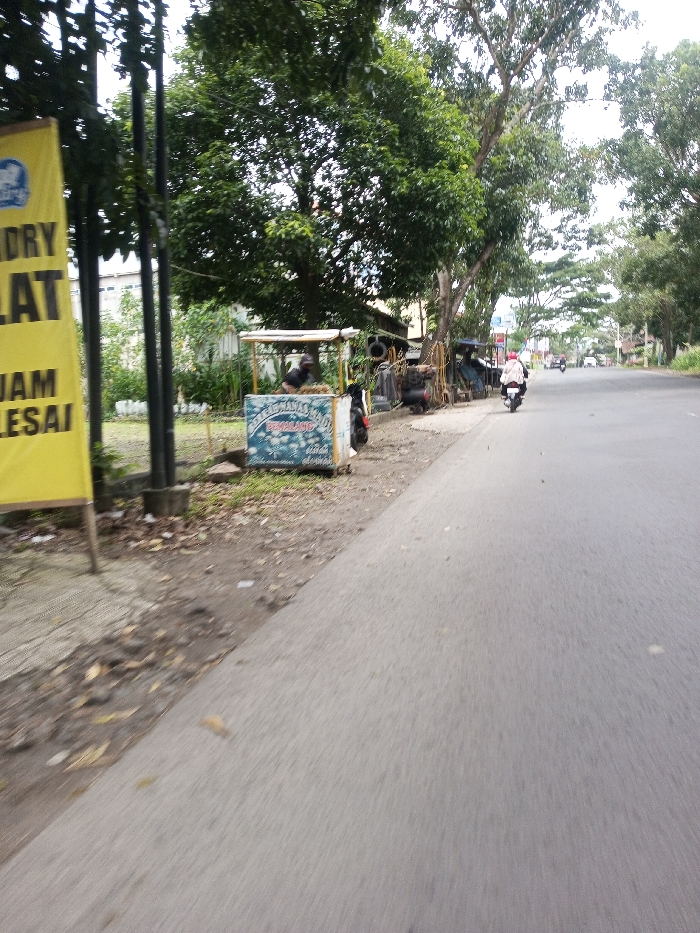 The image depicts an outdoor roadside scene in the city of Khajuripada, India. An asphalt road occupies the right and central portions of the frame, extending into the distance. To the left of the road is an unpaved dirt shoulder, transitioning into a grassy area with trees and black utility poles. On the far left, a yellow banner with black text, partially visible, displays words such as 'DRY', 'LAT', 'JAM', and 'LESAI'. In the midground, situated on the dirt shoulder, is a light blue vendor cart. The cart features text, including the word 'PEMALANG', and has items resembling pineapples stacked on its top. A person's head and upper torso are visible behind the cart, facing towards the road. Adjacent to the vendor cart, several motorcycles are parked or stored under the canopy of trees and makeshift structures, suggesting a roadside repair or service area. Some motorcycles appear partially covered or disassembled. On the asphalt road, a single individual wearing a light-colored helmet and a red or pink head covering is operating a white scooter or motorcycle, traveling away from the camera. Additional vehicles, primarily motorcycles, are visible further down the road in the background. The environment is characterized by abundant green foliage from numerous trees lining the road, and the sky appears overcast.