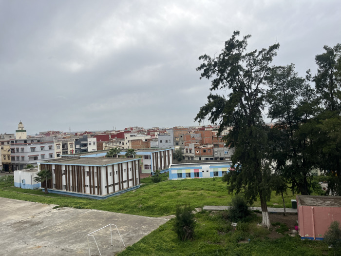 An elevated view depicts a segment of Ksar-el-Kebir, Morocco, under an overcast sky. In the immediate foreground, a weathered concrete surface occupies the lower left, featuring a small white metal structure resembling a goalpost. Adjacent to this, and extending into the midground, are areas of unkempt green grass, punctuated by several tall, dark-foliaged trees on the right. The midground is dominated by two distinct institutional-style buildings. The most prominent is a two-story rectangular structure with a flat roof, its facade characterized by vertical brown slat-like panels interspersed with white sections and small rectangular windows. Its base is painted light blue, and two small palm trees are situated near its perimeter. To its right, partially obscured by trees, another multi-story building displays a lighter blue base and sections of colorful, square facade panels in light blue, yellow, and pink. The background presents a dense urban sprawl, consisting primarily of two to four-story residential and commercial buildings. These structures exhibit a variety of finishes, including white, beige, and reddish-brown hues, with numerous flat roofs often showing exposed rebar. A distinctive white minaret with a green conical top is visible on the far left horizon, rising above the cityscape. No individuals or specific actions are discernible within the scene.