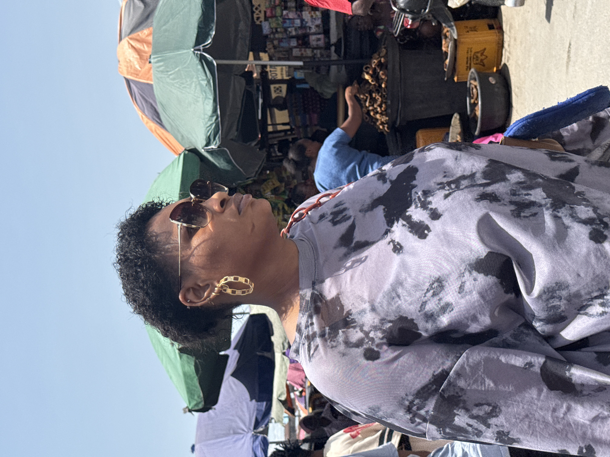 The image depicts a person wearing sunglasses and gold hoop earrings, positioned in the foreground against a bustling backdrop. The person is wearing a gray tie-dye top. In the background, there is a market scene with vendors and customers under colorful umbrellas. A man in a blue shirt is seen tending to goods. The specific location is presumed to be Ado, Nigeria.