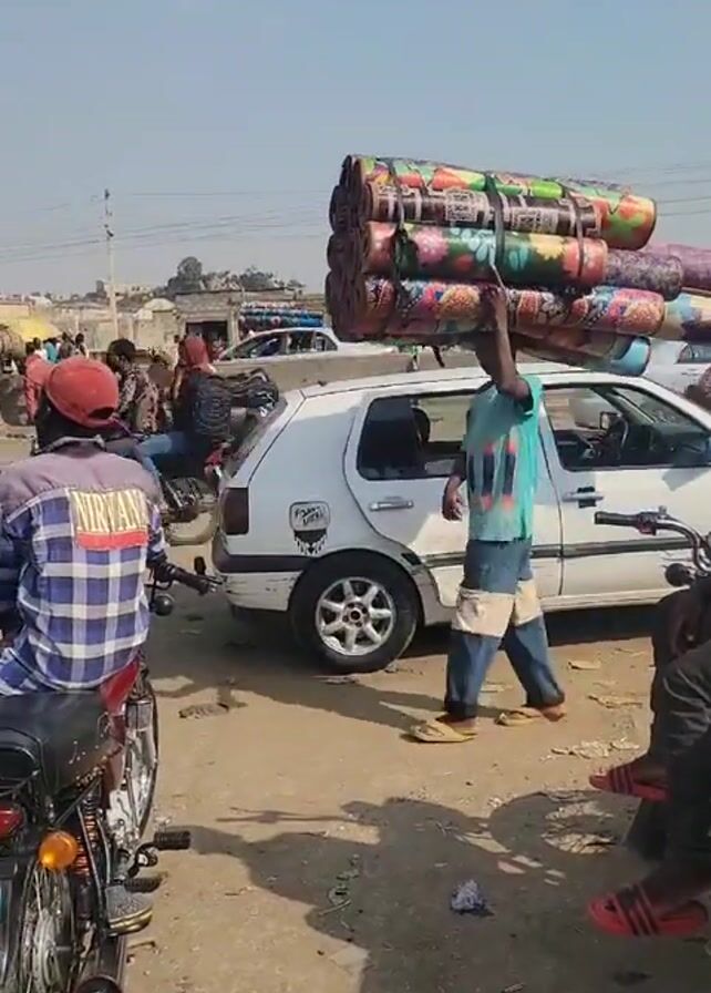 man carrying a stack of rolled-up mats on his head, walking alongside a white car in a busy street. The man is wearing a light blue shirt, blue shorts, and brown sandals. Two motorcyclists are waiting nearby, one wearing a red cap and a blue and white checked shirt with "NIRVANA" on the back. Other vehicles, including a large truck labeled "DANGOTE", pass by in the background. The area appears to be an urban environment, possibly a market or transit area, with a mix of cars, motorcycles, and pedestrian traffic. The sky is clear and sunny.