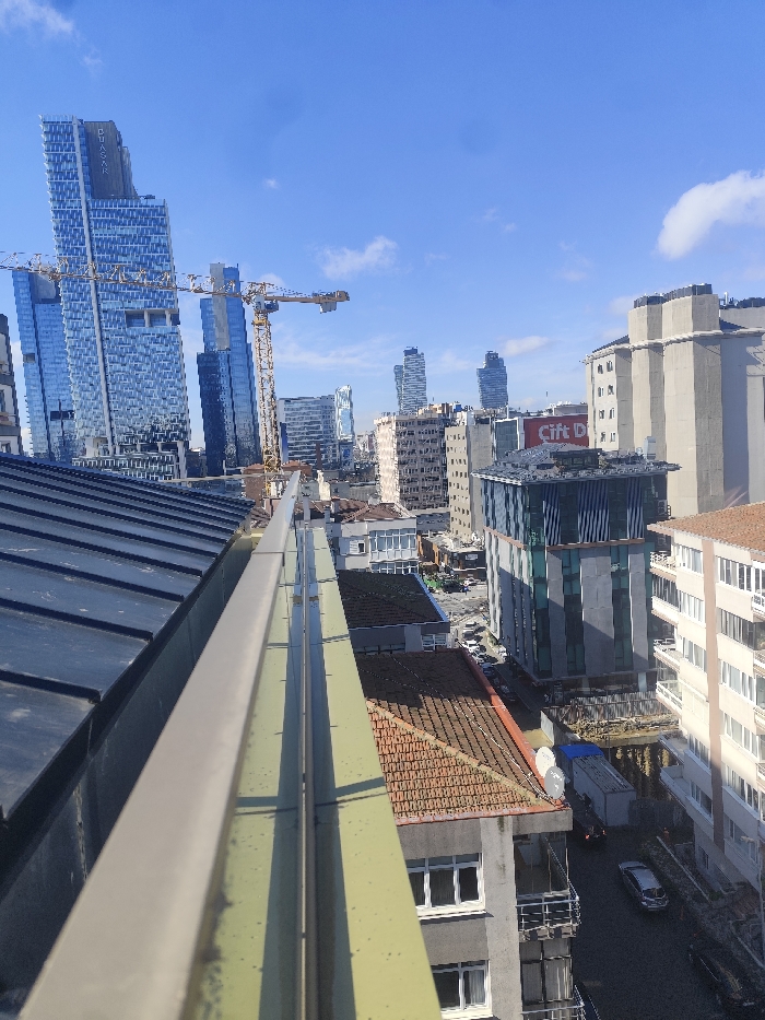 The image presents an elevated, outward-looking view of a dense urban environment within Beşiktaş, Turkey, captured under a bright blue sky with sparse white cumulus clouds. In the immediate foreground on the left, a dark, corrugated metallic roof section is visible. Extending horizontally across the lower center, two parallel, light-colored metal rails, likely part of a balcony or rooftop barrier, are prominent. The midground features a street with vehicular traffic, including a silver sedan and a white truck. Adjacent buildings display varied architecture: one features a reddish-brown tiled roof with two white satellite dishes, while another is a modern structure with dark reflective glass and grey paneling. A construction excavation with visible earth retention walls is present near the street level. A red sign with white text, "Çift D," is visible on a building in this section. The background is characterized by a sprawling skyline. Several prominent blue-tinted glass skyscrapers, including one with "QUASAR" inscribed vertically on its facade, dominate the left side. Multiple large yellow tower cranes are interspersed among these high-rise buildings, signifying active construction. Numerous other residential and commercial buildings, ranging from older, lighter-toned structures to newer, darker ones, extend into the distance. No individuals or specific human interactions are discernible.