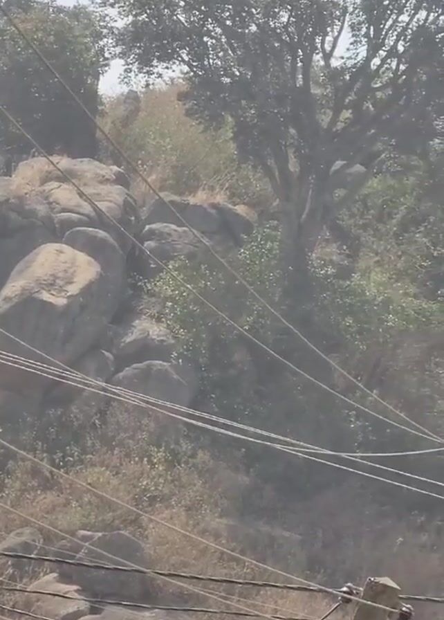 view looking up at a hillside densely covered with rocks, trees, and dry vegetation. Overhead power lines are strung across the view, obscuring parts of the landscape. At the bottom of the frame is a partial view of a building or structure with the letters "W" and "A" visible, likely part of a sign. The lighting is bright, suggesting a sunny day, though the scene has a slightly hazy quality. The camera appears to be stationary, capturing the scene from a fixed position.