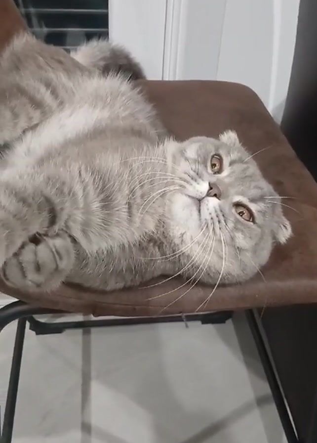 A gray striped Scottish Fold cat lies on its back on a brown padded chair. The cat’s head is tilted back and its mouth is slightly open. It then turns its head to face the camera, revealing its large, orange eyes. The chair has black metal legs and is sitting on a tiled floor. In the background is a window with blinds.