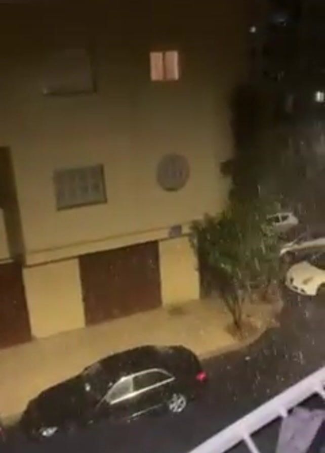 street scene at night, likely from a balcony perspective. It's raining heavily, with white streaks indicating the intensity of the downpour. A few parked cars are visible along the street, reflecting the streetlights. Buildings line both sides of the street, with illuminated windows. The camera pans slightly, offering a wider view of the urban environment. The focus is on the weather conditions and the overall atmosphere of the scene.