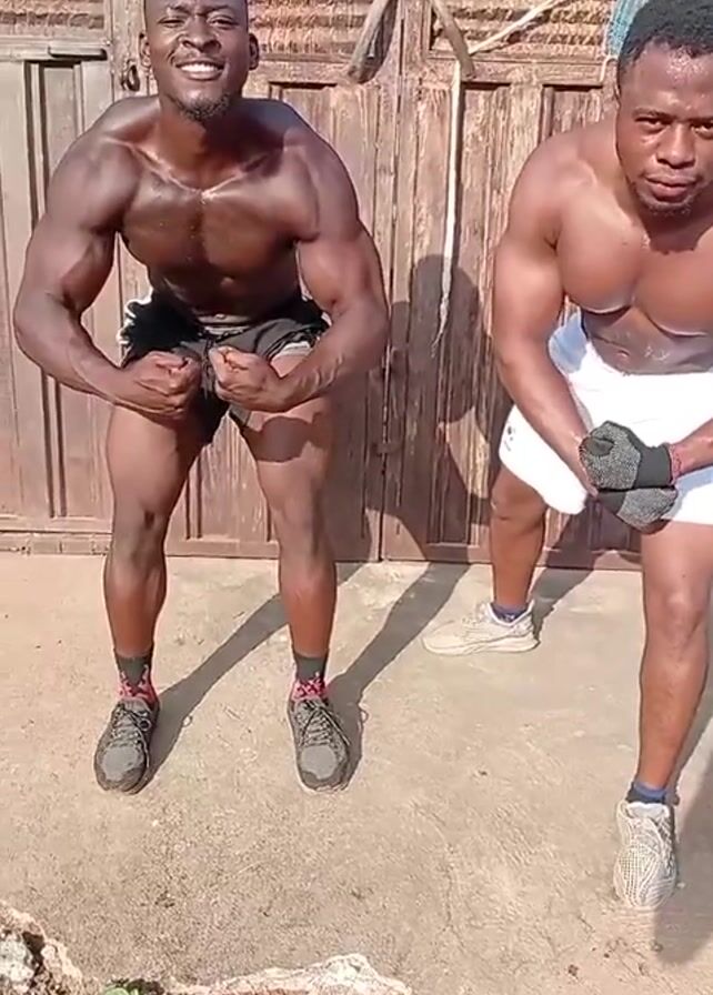 Two muscular men, shirtless and wearing shorts, are standing outside posing