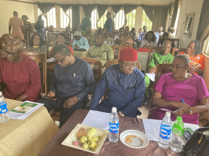 The image depicts an indoor gathering of approximately 30-40 adults in a room located in Umuahia, Nigeria