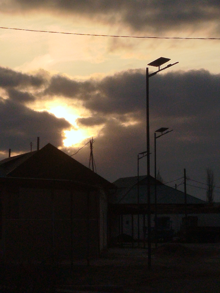The image presents a twilight or dawn scene in the city of Yarlykay-Kusa, Uzbekistan, characterized by strong backlighting. The sky features extensive dark grey clouds, with a prominent, brilliant yellowish-orange sunburst emanating from a break in the clouds in the upper left-center. A single thin, dark wire or cable horizontally crosses the upper portion of the sky. In the midground, the landscape is largely silhouetted. On the left, a dark building with a distinctive peaked roof is visible, exhibiting a vertical pipe or chimney on its left roofline. To the right, three vertical poles, identified as streetlights, are present. Each streetlight is equipped with a rectangular solar panel positioned at its apex and a horizontal arm supporting an integrated light fixture. The closest streetlight is in the right midground, with two others receding into the background towards the right. Further back, a second building with a lighter-colored, possibly blue or grey, pitched roof is partially discernible. Various utility wires and additional dark posts are scattered throughout the midground. Sparse, dark, vertical tree-like forms are visible in the far background, particularly towards the right side of the frame. The foreground and ground level are uniformly dark and indistinct due to the prevailing lighting conditions. No individuals, vehicles, or specific actions are depicted within the scene.