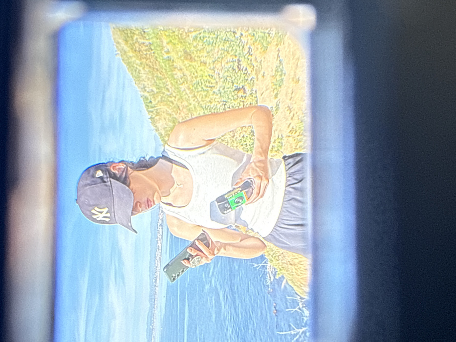 A young female individual is depicted standing on a grassy hillside overlooking the Pacific Ocean in Palos Verdes Estates, United States. The subject wears a dark blue New York Yankees baseball cap, a white sleeveless tank top, and dark shorts. A thin necklace with a small pendant is visible. She holds a dark green smartphone with a circular grip in her left hand, looking down at its screen. In her right hand, she holds a compact, dark-colored electronic device featuring a prominent green label. The background includes a vast blue ocean meeting a clear sky, with a distant landmass visible on the horizon to the left. The immediate right background shows a sun-drenched, dry-looking grassy slope. The image is framed by a dark, rectangular border, suggesting it was captured through a device's viewfinder.