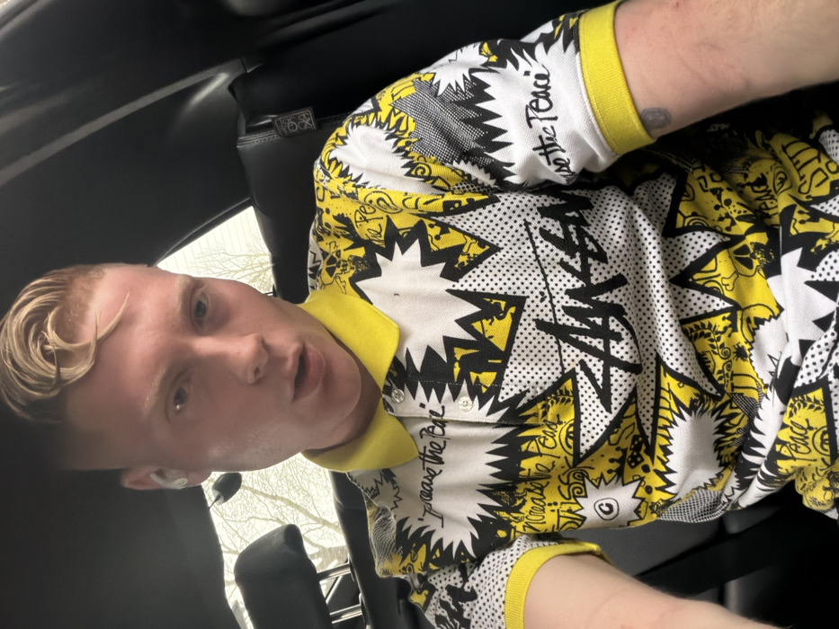 A close-up, chest-up image depicts a fair-skinned male in his twenties, positioned within the rear passenger compartment of a vehicle. He has reddish-blonde hair styled in a prominent quiff with faded sides and wears a white wireless earbud in his left ear. His mouth is slightly open, and he looks directly forward. He is dressed in a short-sleeved polo shirt with a yellow collar and cuffs, featuring a pop-art style pattern in yellow, black, and white, including starbursts, text (e.g., "Stussy," "increase the peace"), skulls, and peace signs. A faint, dark, possibly circular tattoo is visible on his right forearm. The vehicle's interior features dark, likely leather, upholstery on the seat and headrest, with a seatbelt clip visible on the headrest's right side. Through the vehicle's window, bare tree branches are discernible against an overcast sky, indicative of an outdoor, urban or suburban, environment in London, United Kingdom. No specific landmarks are visible to confirm the precise location within London.