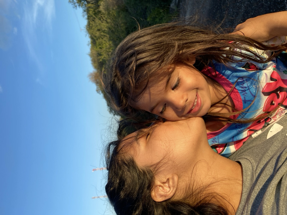A young girl with long brown hair smiles sweetly, her eyes closed, and leans on another person, possibly her mother. The woman, also with dark hair, has her eyes closed and her face tilted upwards. The child wears a colorful shirt, while the woman is in a gray one. The sky is blue in the background, suggesting it is an outdoor setting during the day. Some greenery is visible along the top edge of the image.