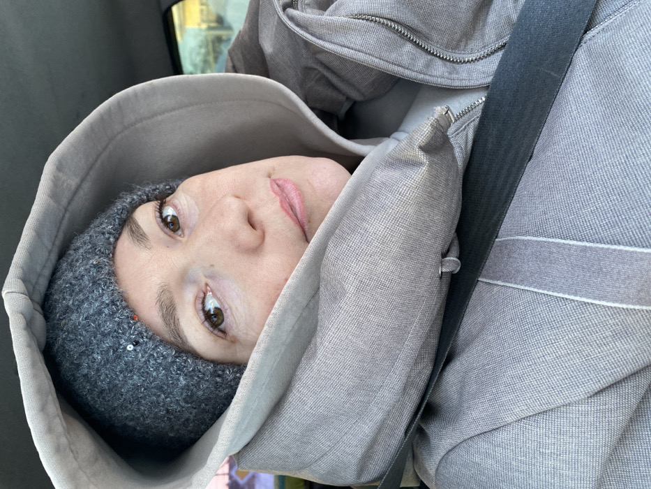 The image depicts an adult female inside a vehicle in Прикамский, Russia. The individual, positioned in the foreground, is looking directly at the camera with a neutral expression. She wears a dark grey ribbed knitted beanie adorned with small, reflective sequins and a single orange bead, beneath a light grey or beige hooded jacket. The jacket's hood is up, framing her face. A black seatbelt is visible across her chest, securing her. Her lips are lightly tinted pink and slightly parted. The background visible through the vehicle's window is out of focus, showing indistinct shapes and colors suggestive of an outdoor, urban environment under daylight conditions.