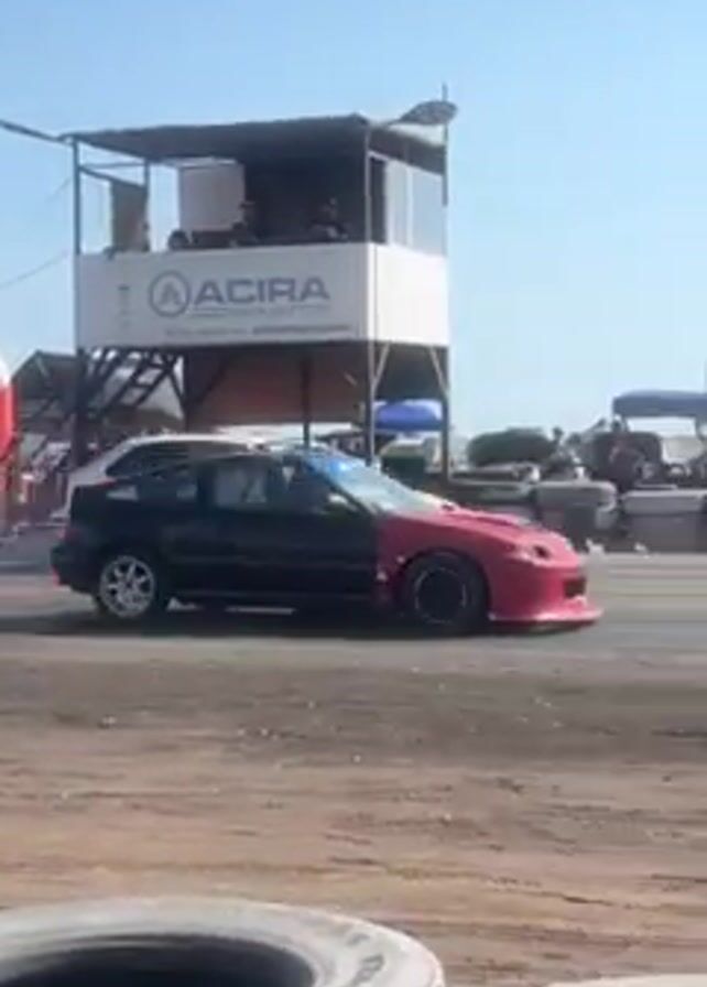 The video captures a car drag race on a dirt track