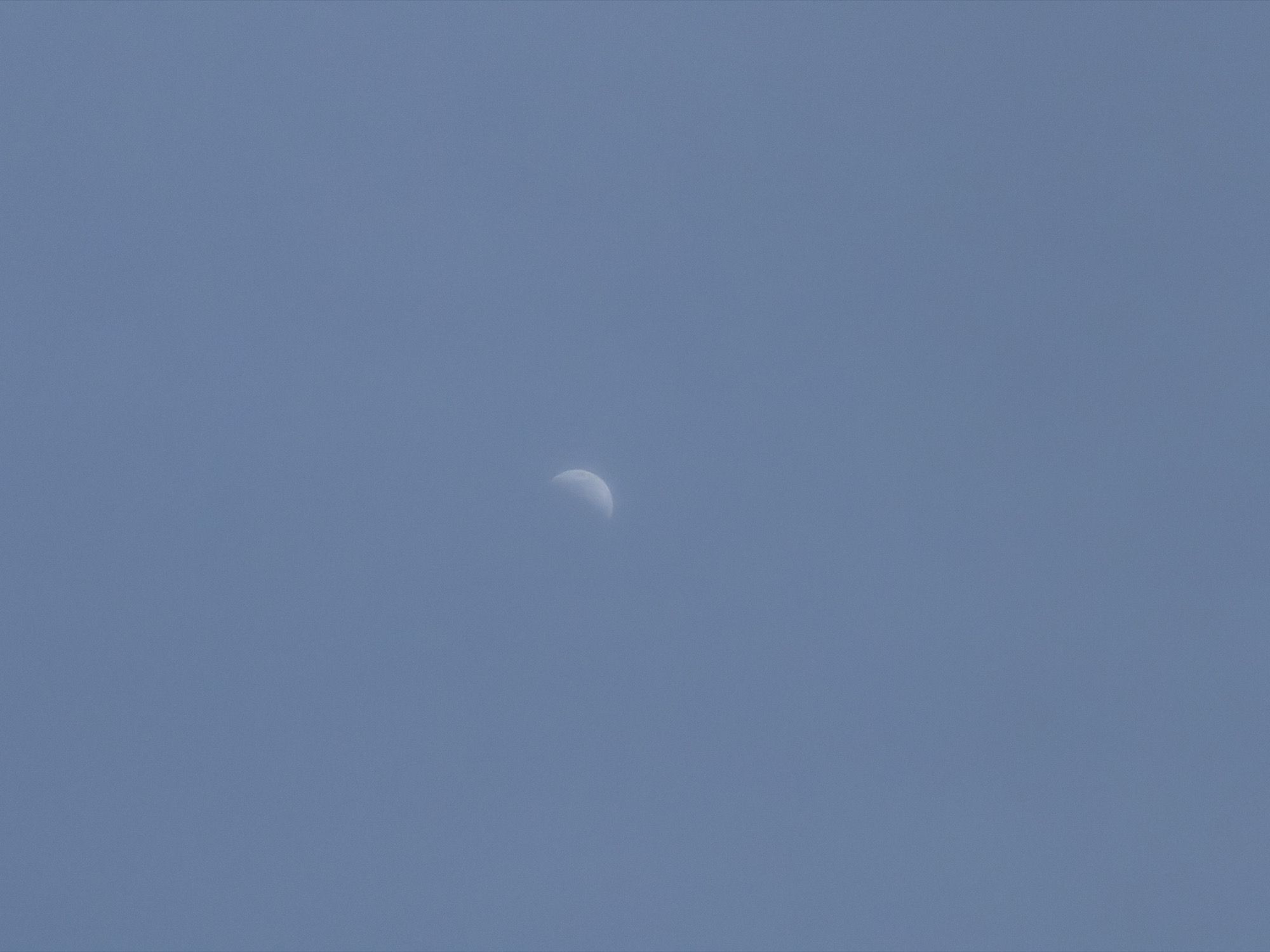 The scene, located in Schifflange, Luxembourg, depicts a clear, uniform blue sky. A white crescent moon, illuminated on its right side, is visible in the upper central portion of the frame. No individuals, other identifiable subjects, objects, actions, or interactions are present.