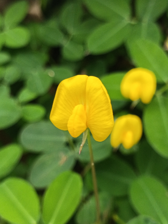 Three bright yellow flowers bloom against a backdrop of lush green clover-like foliage. The primary flower, in sharp focus, showcases a distinctive shape with delicate ridges on its petals. Two other blossoms, slightly blurred, add depth. The composition highlights the vibrant contrast between the blossoms and the surrounding greenery, with the stem of the central flower providing a grounding element.