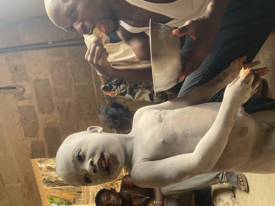 In a semi-enclosed, sunlit space in Achara, Nigeria, defined by unfinished light-brown brick walls, three individuals are present. In the foreground, a young child, appearing to be of short stature and possibly albino, stands partially nude, covered almost entirely in a light-gray or white powdery substance. The child has reddish-brown residue around its mouth and on its chest, and is holding a small, light-colored object in both hands, looking upwards and to the left of the frame. To the child's right and slightly behind, an adult male with a dark complexion and short hair, wearing a white tank top, is seated. He holds a silver metal bowl in his left hand and is actively placing a light-colored piece of food into his mouth with his right hand. Further in the background, another adult male with a dark complexion is seated, partially obscured, wearing a dark top and a necklace, looking forward. Clothes are visible hanging on a wooden pole in the mid-background.