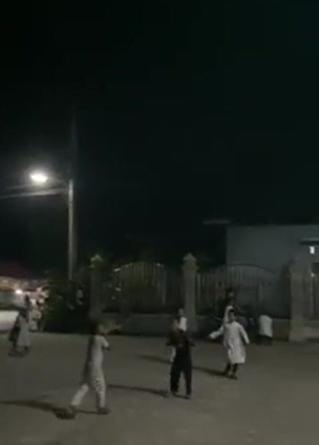At night, a group of children are playing on a paved street. Most of the children are wearing light-colored, robe-like garments. The area is illuminated by a street lamp. There is a gate in the background, behind which sits a building with a green light. Further down the street, there's another building and parked cars. The video captures the children's playful activity under the dim lighting.