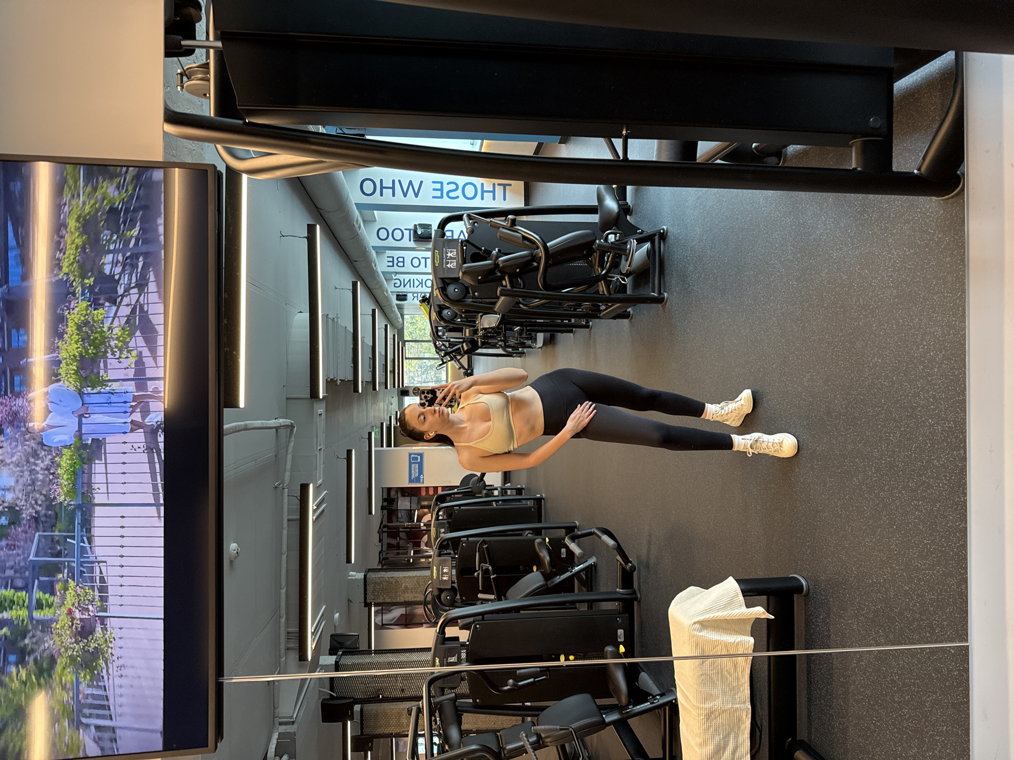 A woman lies prone on the floor of a gym in Sofia, Bulgaria, taking a selfie. She wears a tan sports bra and black leggings with white sneakers. The gym features rows of weight machines and a television displaying an outdoor scene. Signs with reversed text are visible on the walls. The floor is gray with a textured pattern.