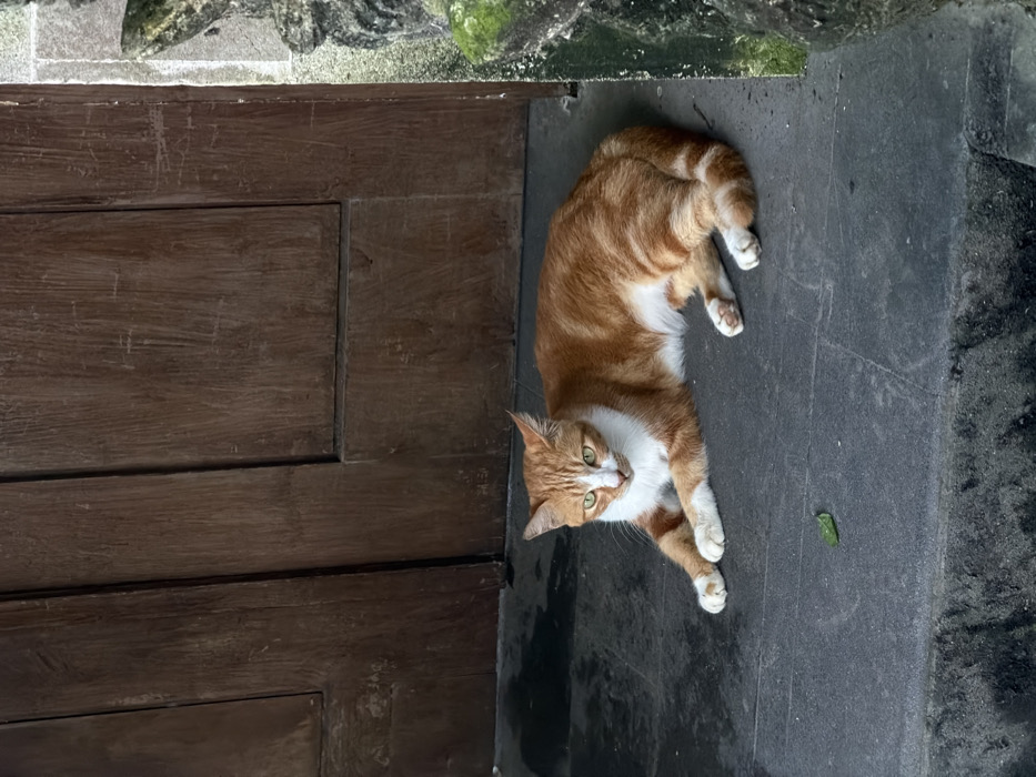 - "A medium-sized orange and white tabby cat is observed lying on a dark grey concrete or stone surface in Tibubeneng, Indonesia" by FM-Y4jCb2, licensed under CC BY 4.0