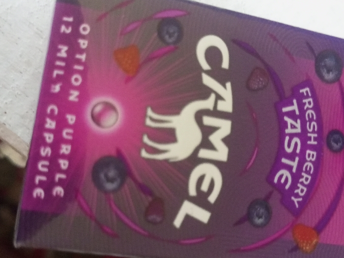 A purple cigarette pack features the "Camel" brand name prominently in white