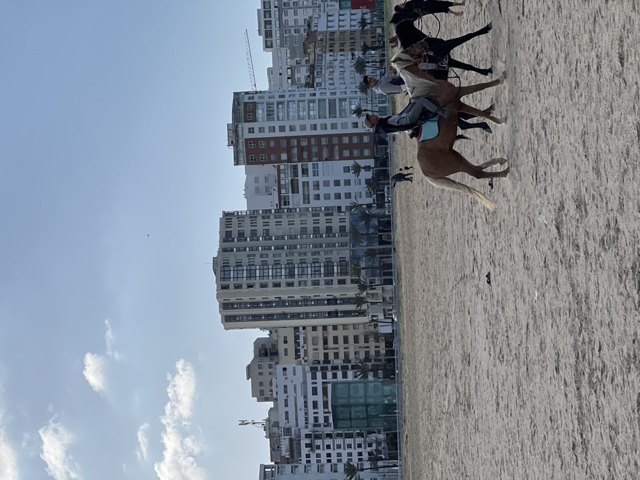 This image depicts a daytime scene on the beach of Tanger طنجة, Morocco, with an urban skyline in the background. The sky is partially cloudy with a clear blue expanse dominating the upper frame. The foreground consists of light-colored sand. Three individuals and three horses are present in the foreground, moving from right to left across the sand. The leftmost rider is mounted on a light brown horse with a light mane and tail, wearing a dark jacket, light pants, and a light-colored baseball cap; a light blue saddle pad is visible. The second rider, on a dark horse, is partially obscured but wears a grey hoodie and light pants. A third individual, visible to the far right, walks alongside or leads a third dark horse, with bare feet visible. A pair of dark flip-flops or sandals rests on the sand to the left of the horses. In the mid-ground, further back on the beach, a small group of two to three individuals is observed walking or standing. The background features a densely packed urban landscape dominated by numerous multi-story buildings, varying in height and architectural style, including residential and commercial structures. A prominent light-colored building with multiple windows stands centrally. Another building exhibits reddish-brown sections. A line of palm trees borders a paved promenade separating the beach from the city buildings. A large, rectangular, translucent green structure is visible near the promenade on the left. A radio or communication tower is present on a rooftop to the left, and a construction crane extends above buildings on the right side of the skyline.