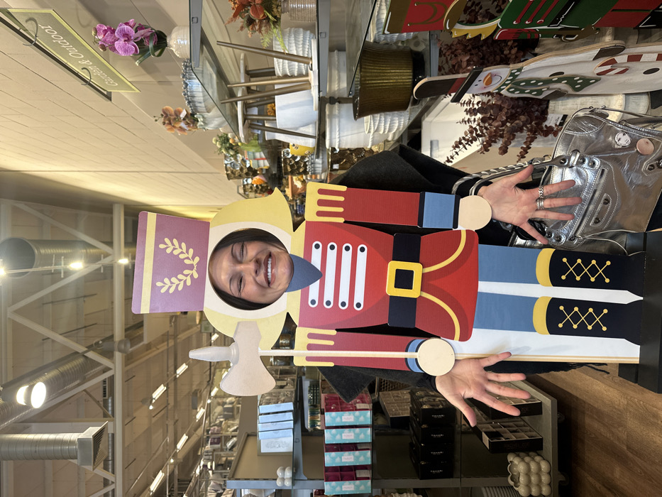An adult female is depicted standing within a large, festive nutcracker soldier cutout in an unspecified retail store in Tonbridge and Malling, United Kingdom