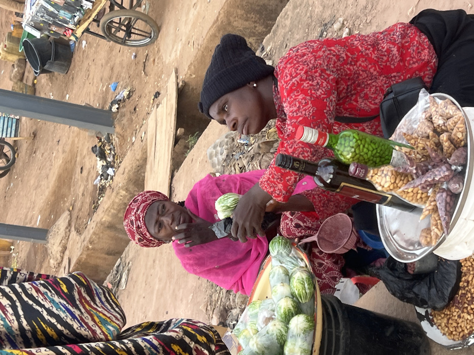 Two women are selling goods outdoors. One woman wears a black knit hat and red floral top while kneeling beside a container of bottled drinks and bagged peanuts. The other woman, in a pink headscarf and top, holds small green gourds, possibly for sale, near a container with more gourds. The scene includes a metal structure, a wheelbarrow, and visible trash in the background, suggesting a marketplace or roadside setting.