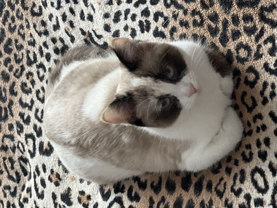 A domestic cat is observed resting on a leopard print textile surface. The cat exhibits a colorpoint pattern, featuring a predominantly white face, chest, and front paws, with dark brown markings on its ears, muzzle (forming a mask around light blue eyes), and parts of its body. The body fur is a mix of light brown, cream, and white. The cat is positioned in a "loaf" posture, with its front paws tucked beneath its chest, facing directly towards the viewer. The background consists entirely of the leopard print textile, displaying irregular black and dark brown spots on a tan and beige base, suggesting an indoor environment. No specific landmarks or indicators are present to confirm a location within Votkinsk, Russia.
