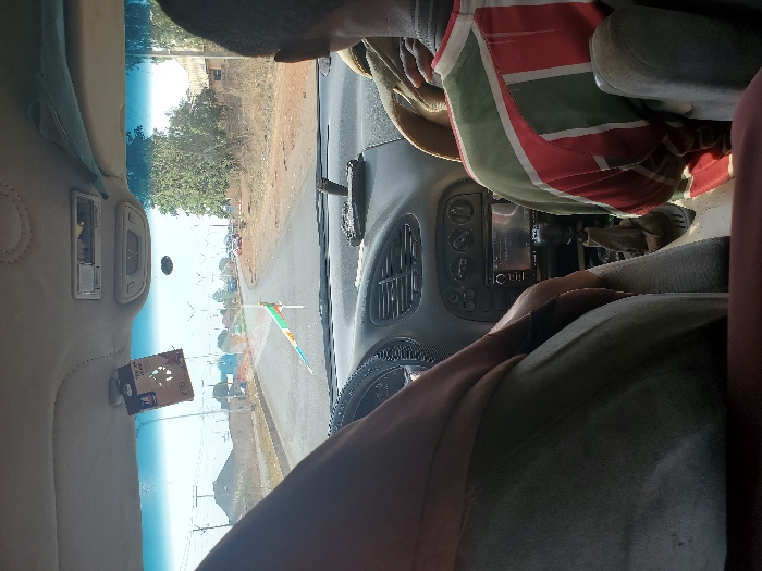 The image captures a forward-facing view from inside a vehicle traveling on a paved road in Ladura Foron, Nigeria