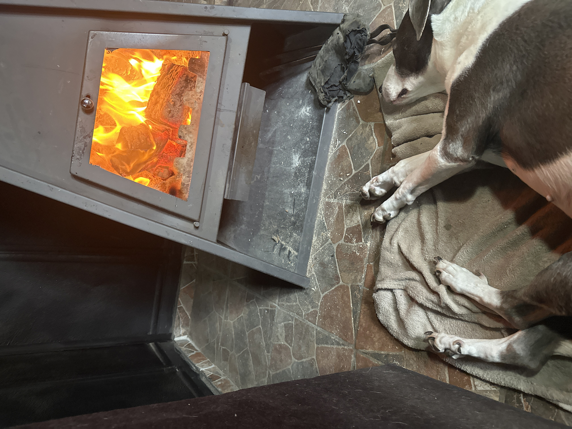 An indoor scene in Aldomirovtsi, Bulgaria, depicts a domestic setting focused on a heat source and a resting animal. In the upper right quadrant, a grey, metallic wood-burning stove with a glass door is actively burning logs, producing bright orange and yellow flames. A small, spherical handle is visible on the stove door. Below the firebox, an ash collection area is partially covered in white residue, likely ash or sawdust. To the right of the stove's base, a dark, crumpled fabric object, possibly a glove or rag, rests on the floor next to thin, dark metal rods, possibly fire tools. The floor is composed of irregular, multi-toned tiles in shades of brown, grey, and red, with scattered white particulate matter (ash/sawdust) particularly around the stove. On the left, dark, vertically paneled walls frame the scene. In the lower half of the image, a large dog is lying on its back on a light brown, textured blanket or mat. The dog exhibits white fur with dark brown patches on its body and head. Its hind legs are extended towards the left, and its head, with visible snout and ear, is turned upwards towards the stove, indicating a relaxed posture near the heat source.