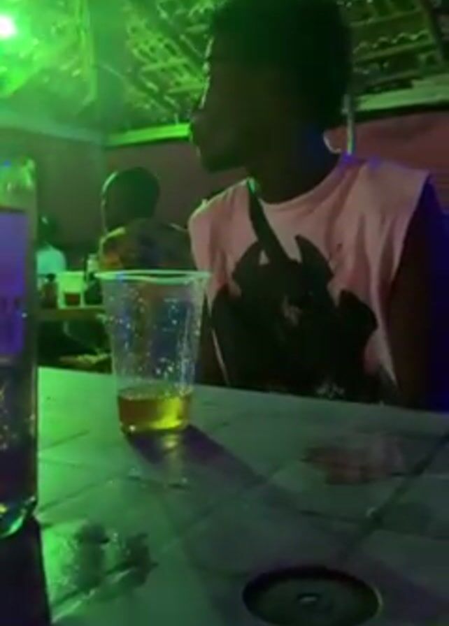 A dimly lit indoor space is the setting, illuminated with green and blue lighting. The room has a thatched roof. A young man sits at a square plastic table, a bottle and a partially full plastic cup of amber liquid resting on it. Other people are vaguely visible in the background, seated at tables. The young man looks around, then picks up the plastic cup, fingers briefly touching the rim. A patterned shirt can be seen on one of the figures in the background.