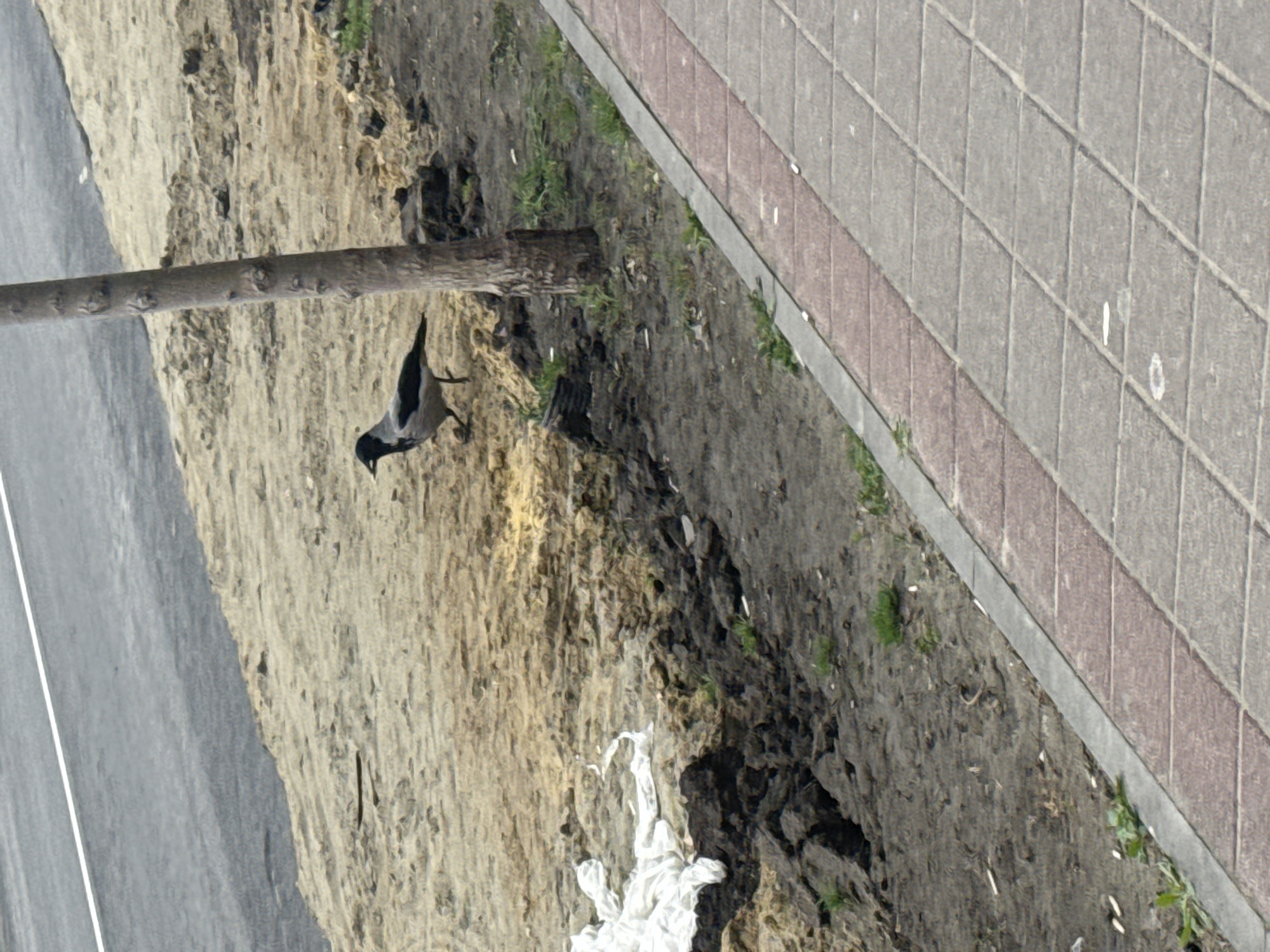A crow is perched on a branch, standing over a dirt embankment next to a sidewalk in Anapa, Russia. The crow has a gray body and black wings. The embankment is dirt and sand with sparse vegetation. The sidewalk is made of concrete pavers. A road with a white line is visible on the left.