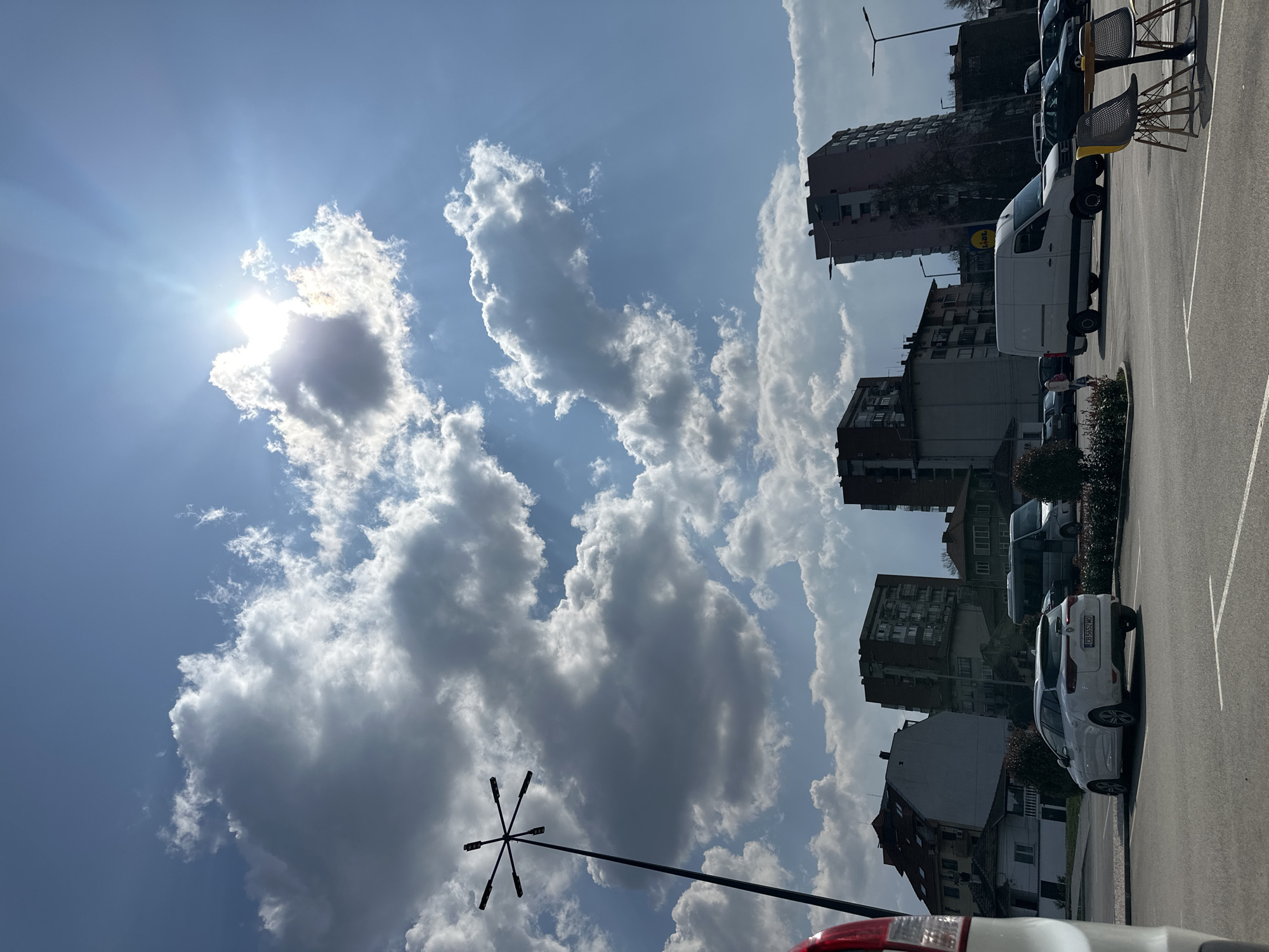 The image depicts an urban parking lot scene under a bright, partly cloudy sky in Lovech, Bulgaria. The sun, partially obscured by a large cumulus cloud, emits strong rays from the upper right quadrant of the frame. In the immediate foreground on the left, the upper portion of a white vehicle's rear is visible. A tall, black street light pole featuring a six-armed radial fixture extends upwards from the lower-left. The mid-ground consists of a paved parking lot with white painted markings. A white Renault Megane station wagon, bearing Bulgarian license plate CB 5652 MC, is parked facing away from the viewer. Behind it, a dark grey minivan is partially visible. To the right, a white delivery van is parked. Further right, two outdoor chairs, one yellow and one dark grey, are arranged with a small round table, indicating an outdoor seating area. A lone pedestrian, dressed in light and dark clothing, walks in the distance near the white van. Low, manicured bushes separate sections of the parking area. The background reveals a dense urban landscape characterized by a mix of buildings. On the left, a white house with a red-tiled roof is present. Multiple multi-story apartment buildings, varying in color and architectural style, rise in the mid-distance, including a tall, light pink/beige block on the right. A yellow "Lidl" logo sign is visible on a building or signpost in the mid-background. Additional streetlights are scattered throughout the background, and bare trees are visible among the structures.