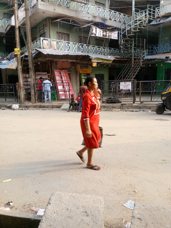 A woman in a red dress walks across a dirt road in front of a multi-story building with weathered balconies and external staircases. The building houses shops and people are seen around it, including a group of children sitting near some red panels. A yellow three-wheeled vehicle is parked on the side. The street is littered with debris.