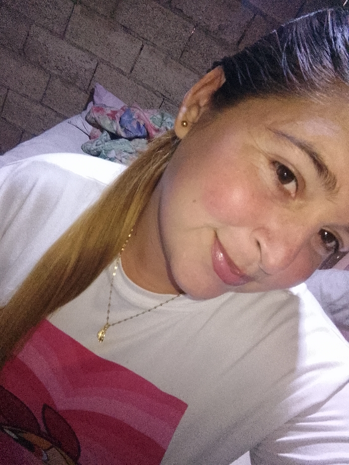 A close-up, angled indoor portrait captures a female individual looking directly at the camera with a slight smile. She presents with light brown hair, darker at the roots and lighter in a ponytail extending over her left shoulder, and a small gold stud earring in her visible right earlobe. She wears a thin, gold-colored necklace with a small, elongated gold pendant, positioned over a white t-shirt that features a partial pink graphic design on the lower left. The background reveals a grey cinder block wall, suggesting an interior space, behind which is a bed partially visible with a white sheet, a light purple pillowcase, and folded colorful patterned textiles. The lighting is artificial. The specific location within the city of Altagracia, Venezuela, is not discernible from the visual evidence present in the image.