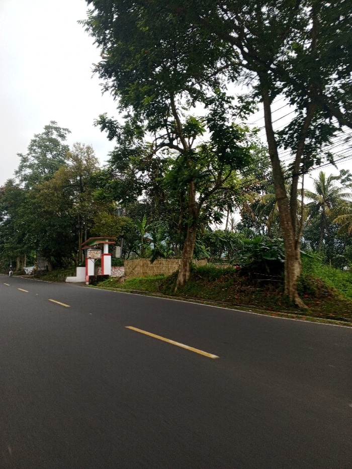 The image displays a roadside scene under an overcast sky in Qorday, Kazakhstan. A dark asphalt road occupies the left foreground, marked by two solid yellow lines near its center and a thinner white line delineating the right edge of the pavement. A solitary, blurry individual on a two-wheeled vehicle is faintly visible in the far distance on the left side of the road, appearing to move away from the viewer. To the right of the road, an elevated, heavily vegetated embankment rises. Numerous tall trees with dense green foliage dominate the right side of the frame, their trunks visible, with some reaching towards the top edge of the image. Further back, more tropical-looking vegetation, including visible palm fronds, is present. A rustic bamboo fence runs along the top of the embankment. Positioned slightly to the left of center on the embankment is a distinctive gate-like structure, primarily white with red accent pillars and a reddish-brown, possibly tiled, roof. An illegible sign is affixed to the archway of this structure. Below the trees and along the embankment, undergrowth and patches of reddish-orange ground cover are visible. The sky is uniformly light grey and overcast, providing diffuse lighting for the scene.