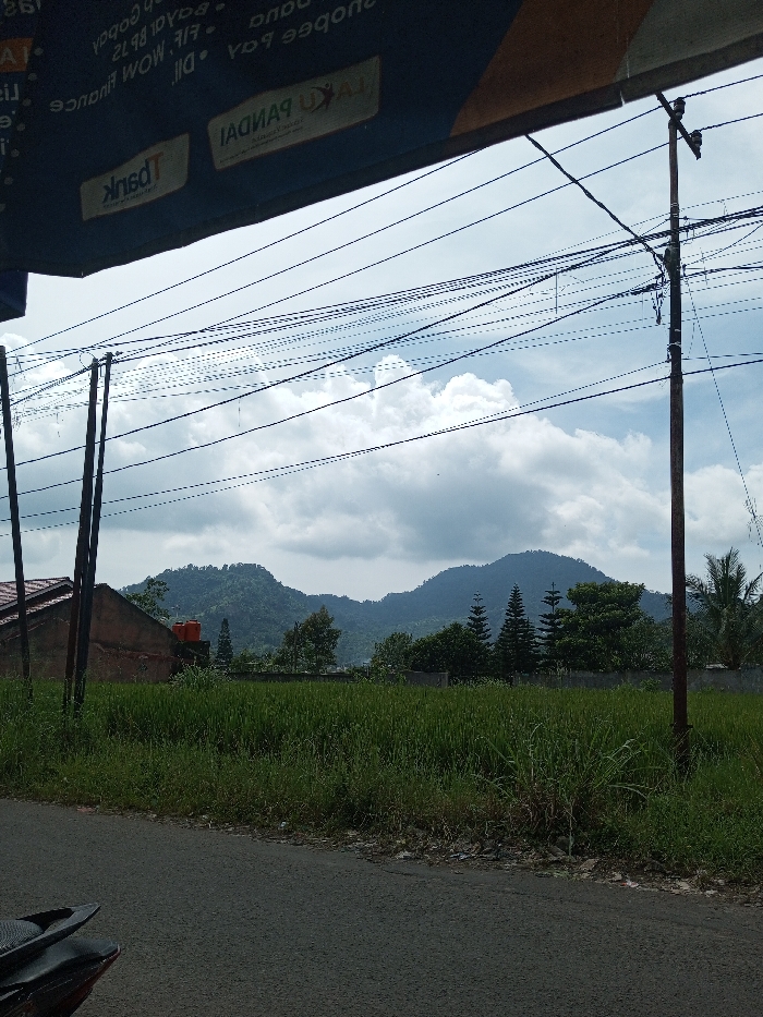 The scene is a daytime exterior in the city of Namthoung, Laos. The foreground features a dark asphalt road running from the lower left, bordered by overgrown green grass and weeds. A black motorcycle seat and rear fender are partially visible in the bottom left. Directly overhead, an inverted dark banner displays fragmented white text, including "K PANDAI" and "Bank". The midground includes multiple dark utility poles with a dense network of black overhead wires crisscrossing against a cloudy sky. A flat expanse of uniform green vegetation, consistent with an agricultural field, is present behind the foreground elements. Behind this field, on the left, a reddish-brown building with a dark roof and an orange cylindrical water tank is observed. A grey concrete wall extends horizontally across the frame behind the field. The background consists of a prominent range of lush, tree-covered mountains beneath a sky populated by significant white and grey cumulus clouds. Various trees, including several tall conical evergreens and a palm tree on the far right, are situated at the base of the mountains. No human figures or discernible activity are present.