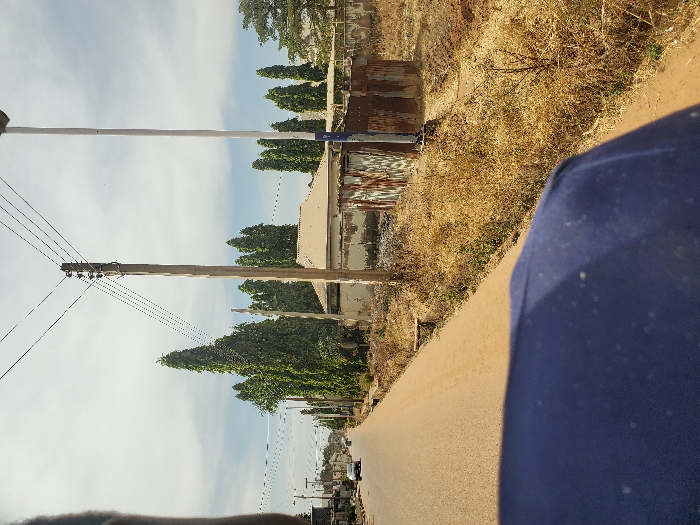 The image displays a daytime scene in Bar Jirgi Summa, Nigeria, featuring an unpaved, tan-colored road extending into the distance under a partly cloudy sky. The bottom left foreground shows the dark blue shoulder of an unseen individual or object. On the left side of the road, utility poles carrying multiple power lines run parallel, interspersed with tall, slender green trees and obscured buildings. A single white sedan is visible in the far distance on the left lane, heading away from the viewer. The right side of the road features a raised dirt shoulder adjacent to an area of dry, brown vegetation. A wooden utility pole with power lines is prominent in the mid-ground on the right, next to a tall, slender pole painted white and blue. Behind these poles, a single-story building with a light-colored corrugated metal roof and partially exposed concrete walls stands, beside a structure made of rusty corrugated metal sheets. Further right, more tall green trees are visible in the background, along with additional dry vegetation on an undeveloped plot of land.