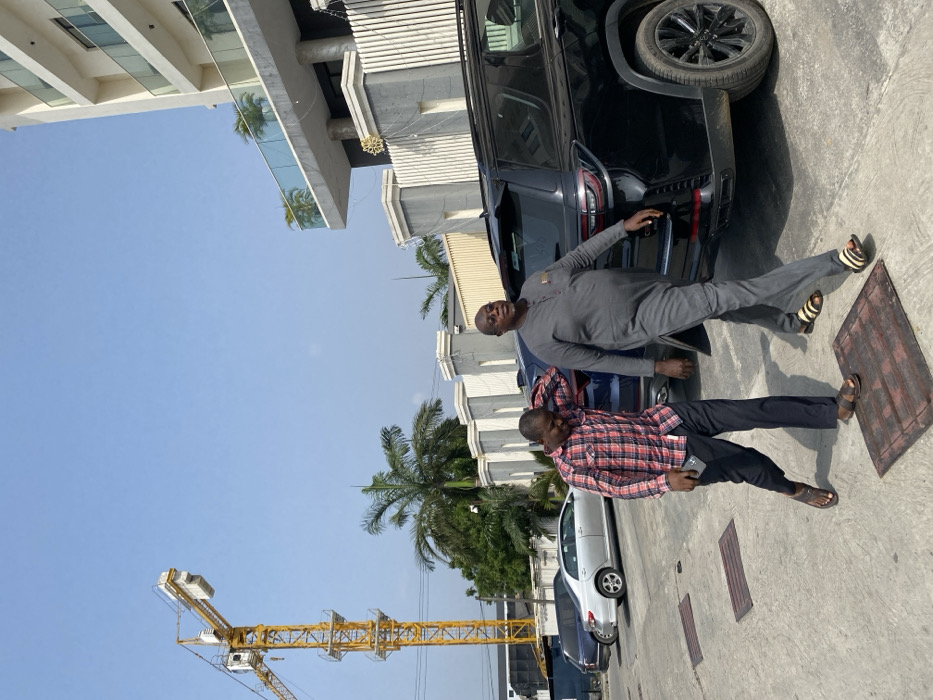 This image depicts an outdoor scene in Moba, Nigeria, featuring two adult males walking on a paved surface under a clear blue sky. On the left, a younger male wearing a red and black plaid shirt, dark trousers, and brown flip-flops holds a smartphone in his right hand while his left hand is near his head, and he looks downwards. To his right, an older, heavier-set male dressed in a grey tunic with matching trousers and black and white striped slide sandals, displaying a yellow badge on his left chest, walks forward, looking slightly to his right. Both individuals are moving from left to right. In the background, a multi-story building with multiple balconies and glass railings is visible, partially obscured by a light-colored fence with vertical slats and a gold snowflake-like ornament. Several palm trees are scattered throughout the mid-ground. A prominent yellow construction crane stands tall on the far left of the frame. Parked vehicles include a black SUV directly behind and to the right of the older male, a silver sedan further back, and a dark sedan beyond that. Three rectangular metal grates are embedded into the paved ground in the foreground.