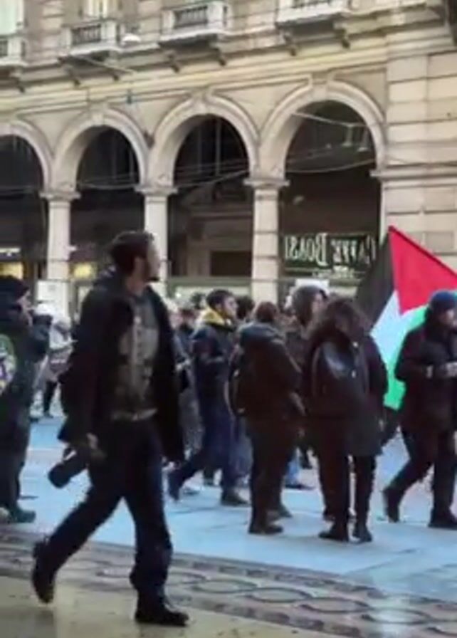 crowd of people standing on a sidewalk in front of a building with arches. The people are of various ages and ethnicities. Many are wearing dark-colored clothing. A Palestinian flag is being carried in the crowd. Some people appear to be taking pictures or videos. The building behind them has a sign that reads "CAFFE BOASI." The sidewalk has a mosaic pattern.